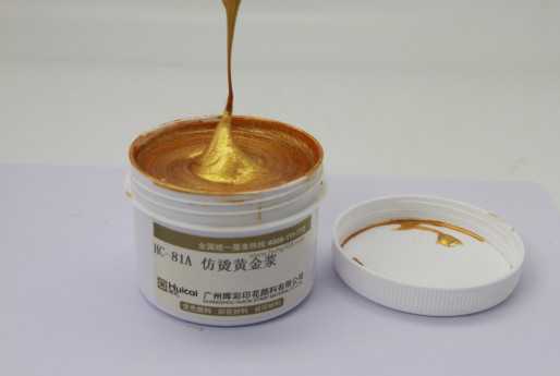 辉彩特亮仿烫金浆、仿烫银浆是将一种类似珍珠闪烁光芒的物质印制在织物上,能耐酸、耐高温、手感好,并有很好的闪光效果,制成的仿烫金浆稳定性好,长期暴露在空气中也不会发暗。