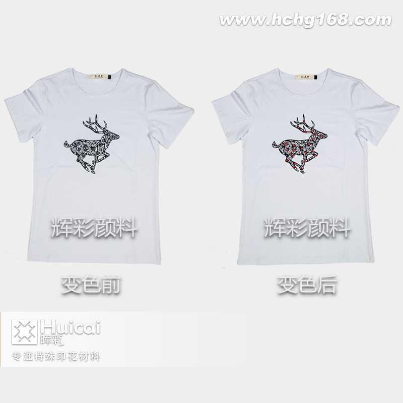 温变粉在特定的温度下是有色変无色,无色变有色的特殊效应具有可逆性,基本有颜色有12中,还可以根据需求混合各种颜色,不过注意的一点就是要由专业人士来进行调色,以免不符合需求颜色。主要应用于布料印花、家居用品、塑料、玩具、鞋材等工艺。布料印花的时候,一般以3-6%左右的比例添加与专用浆中,搅拌均匀后,直接印在浅色的布料上,自然干即可(若是深色布料则需要先打一层白浆)
