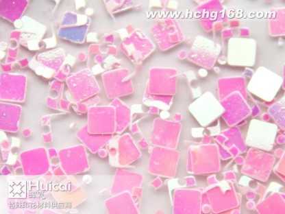 金葱粉:又名闪光片。包括铝质金葱粉,聚酯金葱粉幻彩粉,镭射金葱粉等。有铝质,PETPVC材质。大小规格(size)由1/25601mm)至1/830mm)。形状有六角形,四角形,长条针形和不规则形状,并有多种颜色可供选择。各种材质金葱粉可不同程度承受高温(由80*C180*C300*C不等) 。