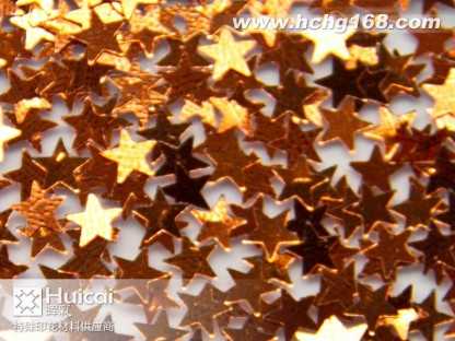 金葱粉:又名闪光片。包括铝质金葱粉,聚酯金葱粉,幻彩粉,镭射金葱粉等。有铝质,PET,PVC材质。大小规格(size)由1/256(0、1mm)至1/8(3、0mm)。形状有六角形,四角形,长条针形和不规则形状,并有多种颜色可供选择。各种材质金葱粉可不同程度承受高温(由80*C,180*C,300*C不等) 。