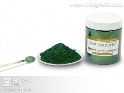 8060灰红变金绿变色龙粉其变色原理为吸收特定波长之紫外光源,藉由该光源之能量而产生颜色变化(变为紫色、红色、黄色、天空兰色),当特定波长的紫外光源不在时,即恢复原来的颜色。