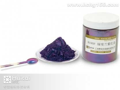 8190F绿变紫红金变色龙粉其变色原理为吸收特定波长之紫外光源,藉由该光源之能量而产生颜色变化(变为紫色、红色、黄色、天空兰色),当特定波长的紫外光源不在时,即恢复原来的颜色。