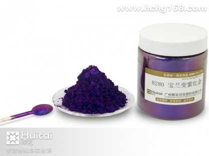 8280宝兰变紫红金变色龙粉其变色原理为吸收特定波长之紫外光源,藉由该光源之能量而产生颜色变化(变为紫色、红色、黄色、天空兰色),当特定波长的紫外光源不在时,即恢复原来的颜色。